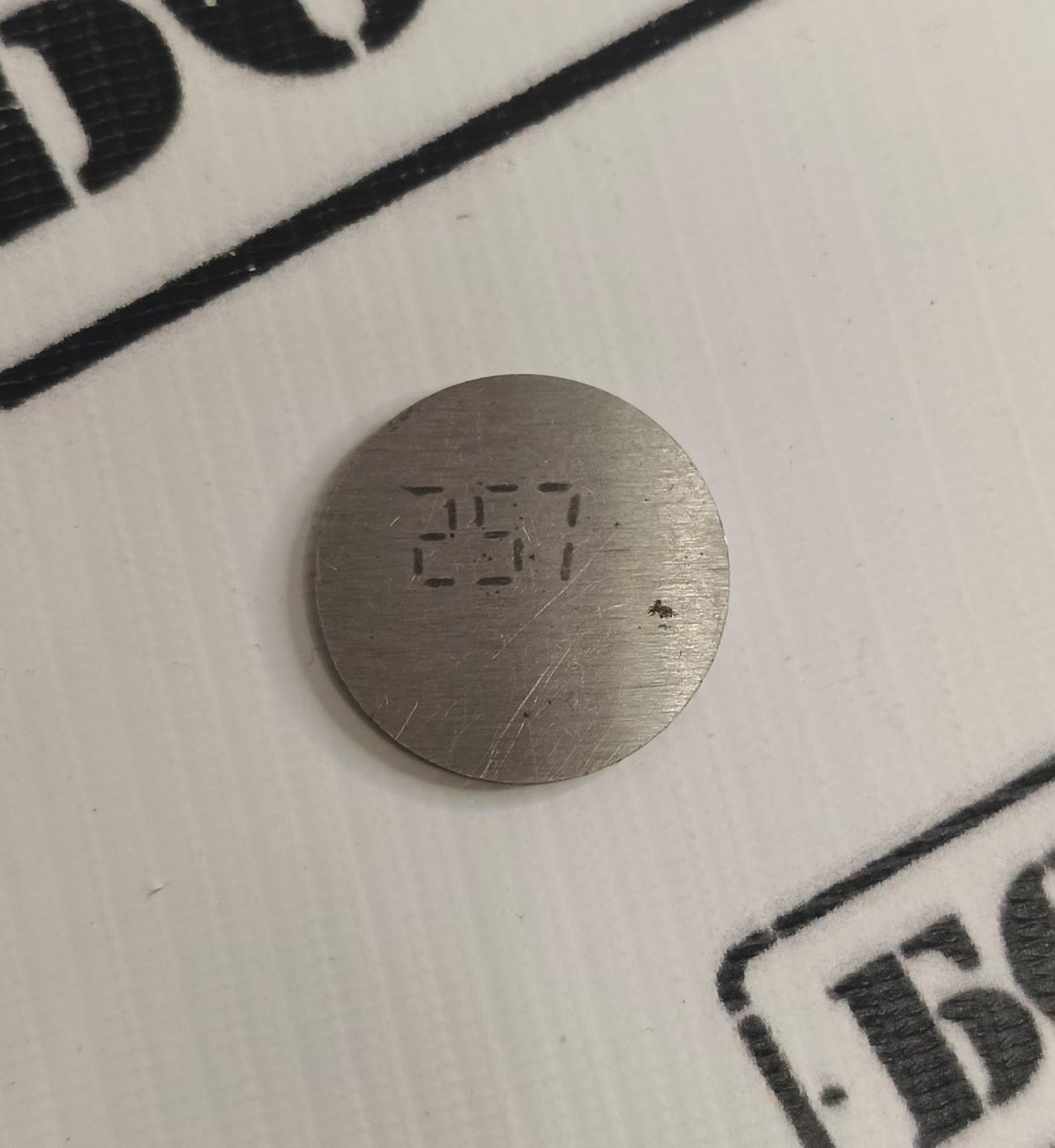 Регулировочная шайба для двигателей 2108-2115, 1118-1119, Приора, Калина 2, Гранта, Ока. Толщина шайбы 2.57 мм. Шайба представляет собой диск из высокопрочной стали с нанесенной на нем маркировкой. Шайбы регулировки клапанов необходимы для изменения зазора между толкателем, установленным на клапан и кулачком распределительного вала. Зазор изменяется за счет установки шайб разной толщины в толкатель.