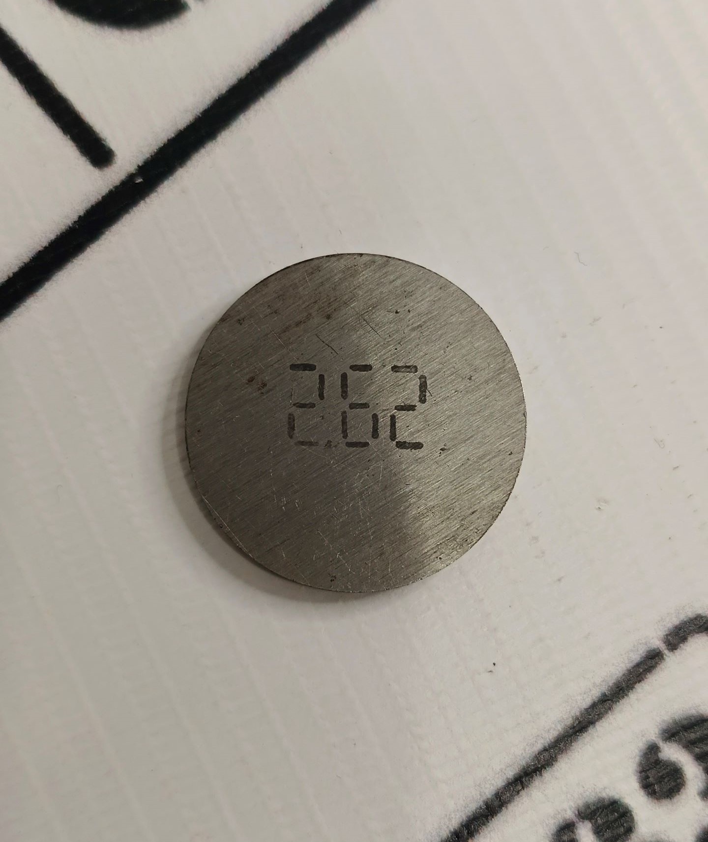 Регулировочная шайба для двигателей 2108-2115, 1118-1119, Приора, Калина 2, Гранта, Ока. Толщина шайбы 2.62 мм. Шайба представляет собой диск из высокопрочной стали с нанесенной на нем маркировкой. Шайбы регулировки клапанов необходимы для изменения зазора между толкателем, установленным на клапан и кулачком распределительного вала. Зазор изменяется за счет установки шайб разной толщины в толкатель.