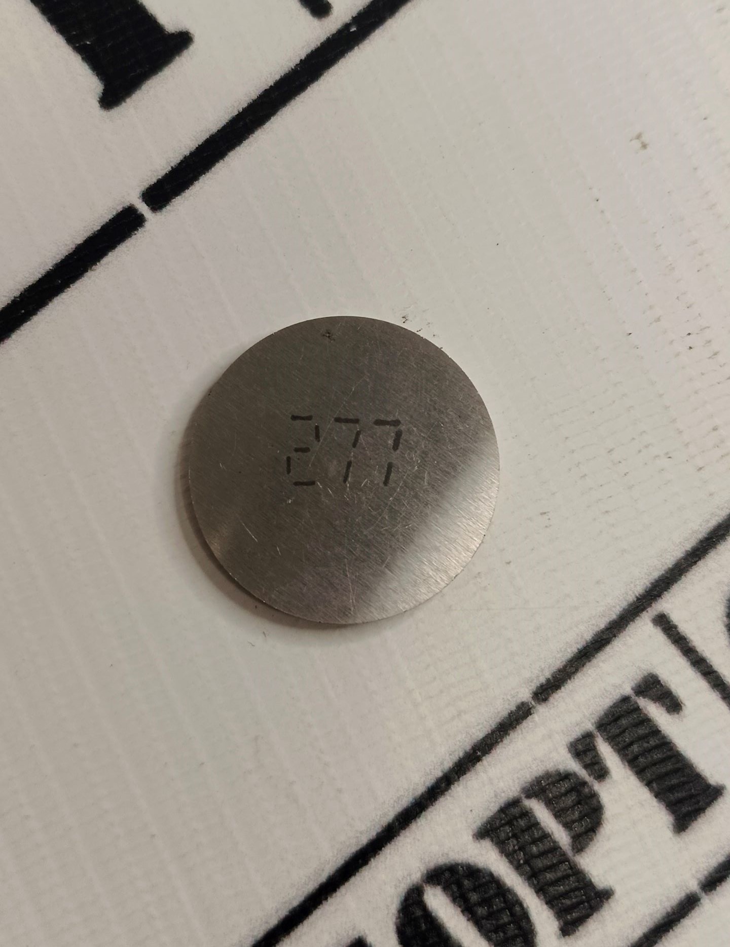 Регулировочная шайба для двигателей 2108-2115, 1118-1119, Приора, Калина 2, Гранта, Ока. Толщина шайбы 2.77 мм. Шайба представляет собой диск из высокопрочной стали с нанесенной на нем маркировкой. Шайбы регулировки клапанов необходимы для изменения зазора между толкателем, установленным на клапан и кулачком распределительного вала. Зазор изменяется за счет установки шайб разной толщины в толкатель.