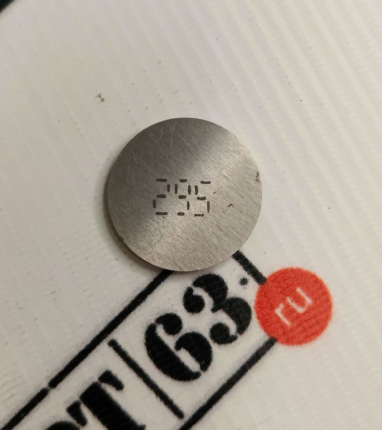 Регулировочная шайба для двигателей 2108-2115, 1118-1119, Приора, Калина 2, Гранта, Ока. Толщина шайбы 2.95 мм. Шайба представляет собой диск из высокопрочной стали с нанесенной на нем маркировкой. Шайбы регулировки клапанов необходимы для изменения зазора между толкателем, установленным на клапан и кулачком распределительного вала. Зазор изменяется за счет установки шайб разной толщины в толкатель.