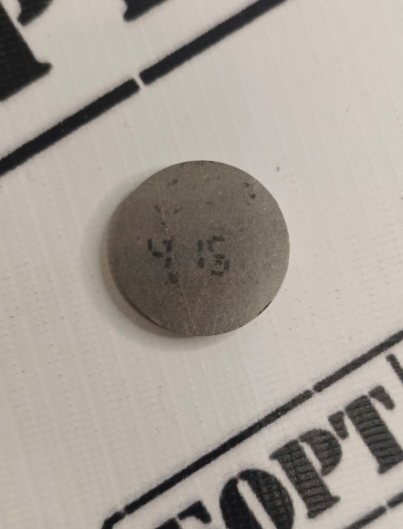Регулировочная шайба для двигателей 2108-2115, 1118-1119, Приора, Калина 2, Гранта, Ока. Толщина шайбы 4.15 мм. Шайба представляет собой диск из высокопрочной стали с нанесенной на нем маркировкой. Шайбы регулировки клапанов необходимы для изменения зазора между толкателем, установленным на клапан и кулачком распределительного вала. Зазор изменяется за счет установки шайб разной толщины в толкатель.
